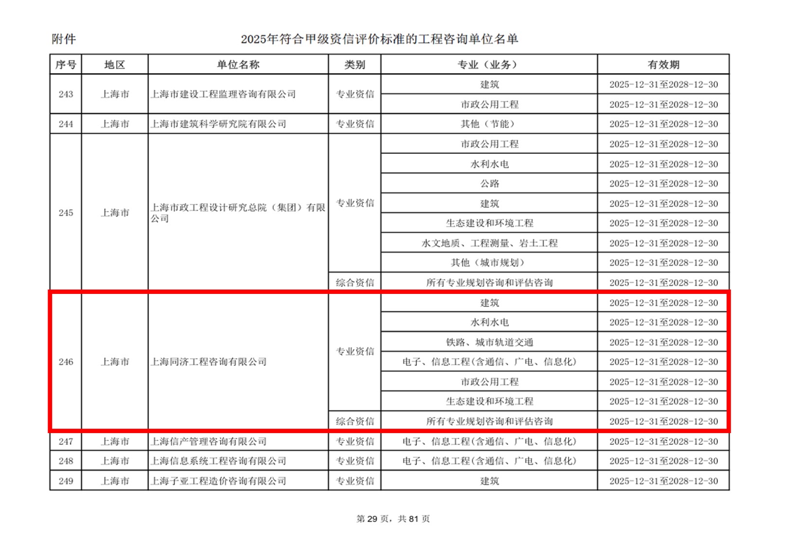 自2018年首次參與資信評價以來,公司已陸續(xù)取得建筑、水利水電、鐵路與城市軌道交通、電子與信息工程(含通信、廣電、信息化)、市政公用工程、生態(tài)建設和環(huán)境工程等6項甲級專業(yè)資信,以及PPP咨詢甲級專項資信。此次甲級綜合資信的獲批,標志著公司已實現(xiàn)工程咨詢甲級資信全類別覆蓋,形成覆蓋全面、結構完整、專業(yè)突出的資信體系,為進一步承接國家重大戰(zhàn)略項目、服務宏觀決策提供堅實支撐。
